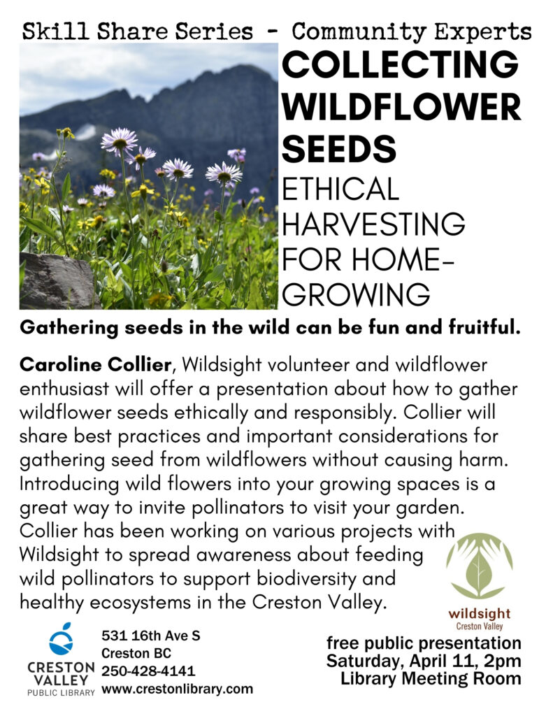 Caroline Collier, Wildsight volunteer and wildflower enthusiast, will offer a presentation about how to gather wildflower seeds ethically and responsibly. Collier will share best practices and important considerations for gathering seed from wildflowers without causing harm. Introducing wild flowers into your growing spaces is a great way to invite pollinators to visit your garden. Collier has been working on various projects with Wildsight to spread awareness about feeding wild pollinators to support biodiversity and healthy ecosystems in the Creston Valley.