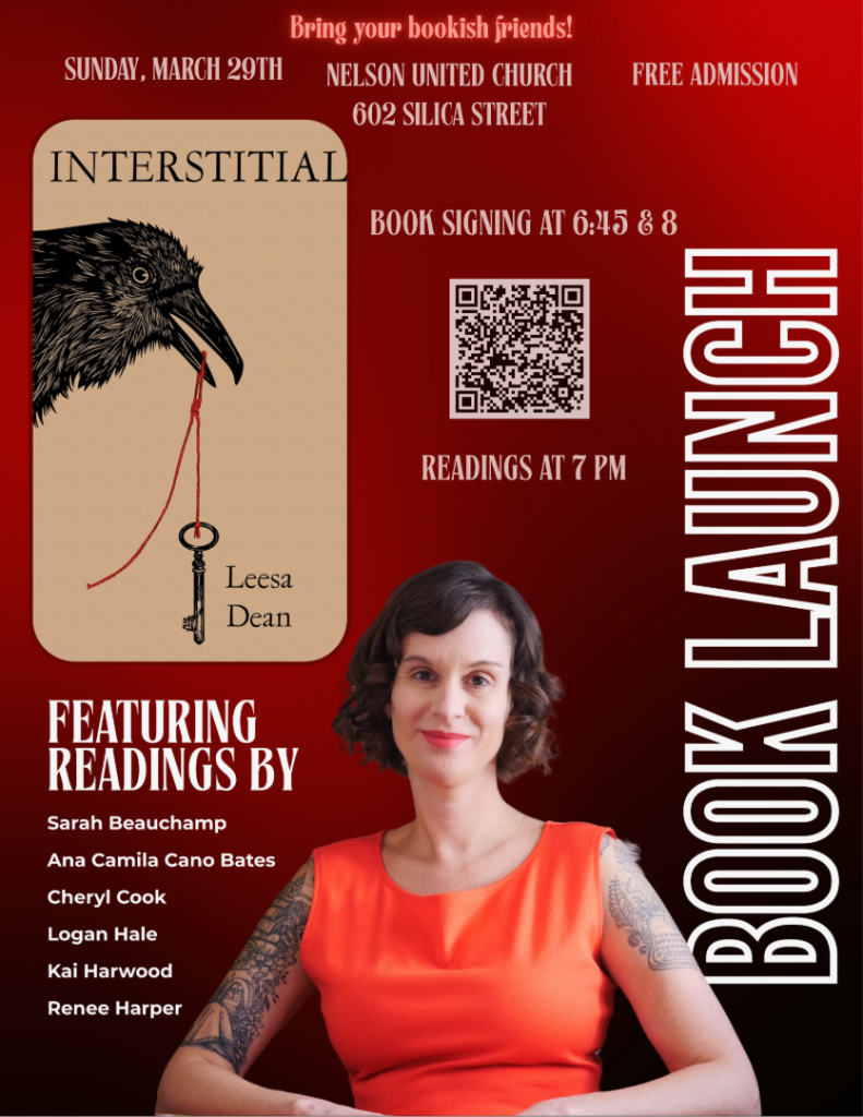 Join author Leesa Dean for a celebration of poetry and the power of community as she launches her third book, Interstitial. The event features readings by six authors: