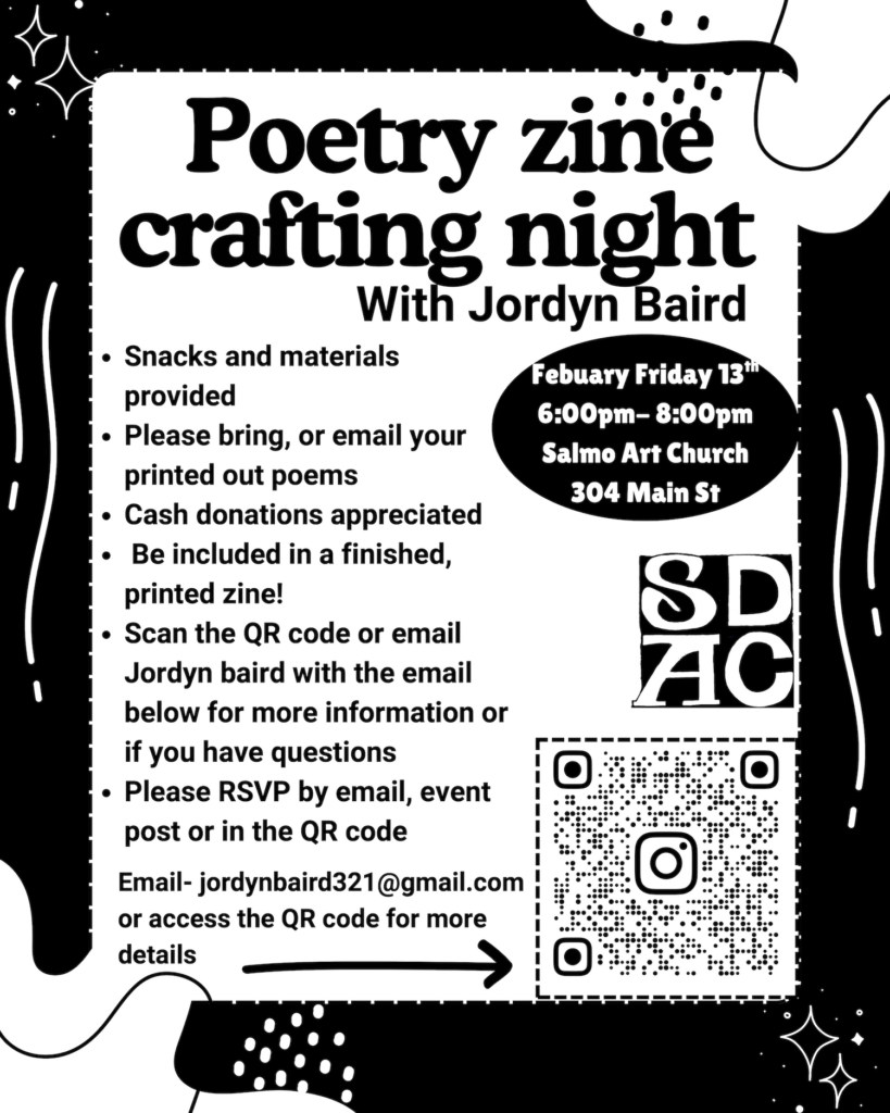 Feb 13 6-8pm at the Salmo Art Church at 304 Main St.