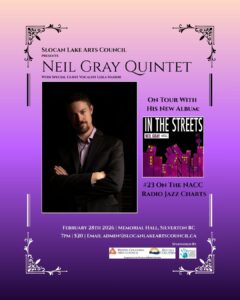 He’s number 23 on the North American Campus College radio jazz and he is bringing his music through the Kootenays this winter with his newest record In the Streets. Drummer and composer Neil Gray plays the Memorial Hall in Silverton BC, February 28th.
