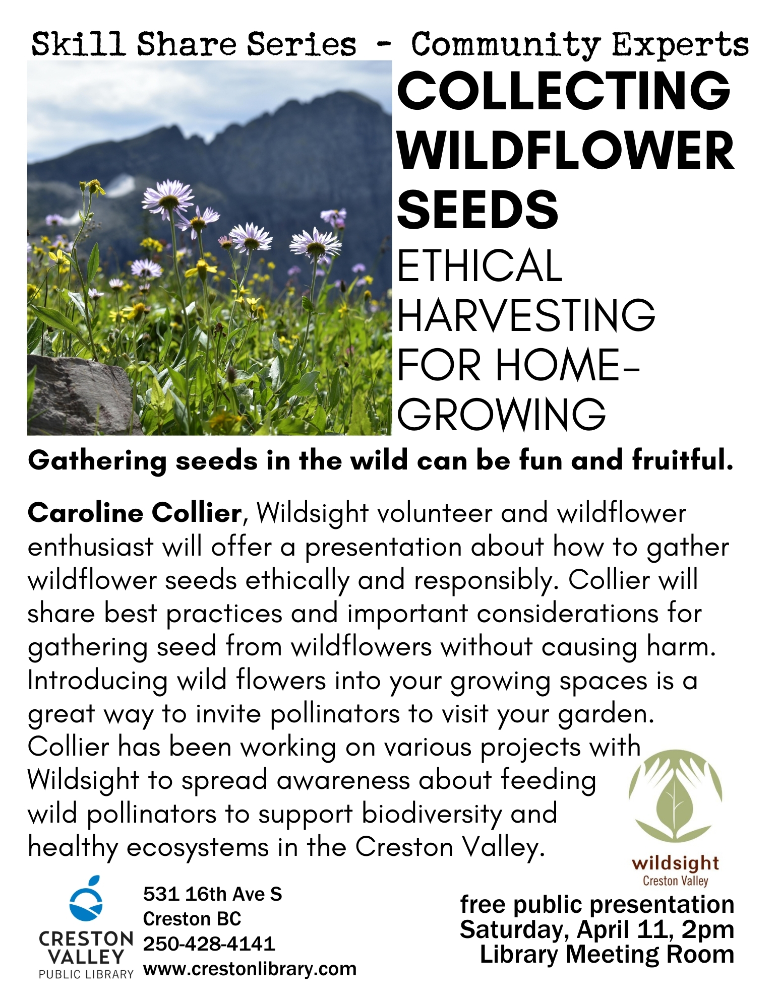 COLLECTING WILDFLOWER SEEDS ETHICAL HARVESTING FOR HOME-GROWING Gathering seeds in the wild can be fun and fruitful. Caroline Collier, Wildsight volunteer and wildflower enthusiast, will offer a presentation about […]